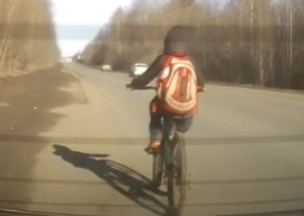 Очевидцы опасаются, что если ничего не сделать, то юный велосипедист, которому по виду нет и 14 лет, может погибнуть под колесами фуры.