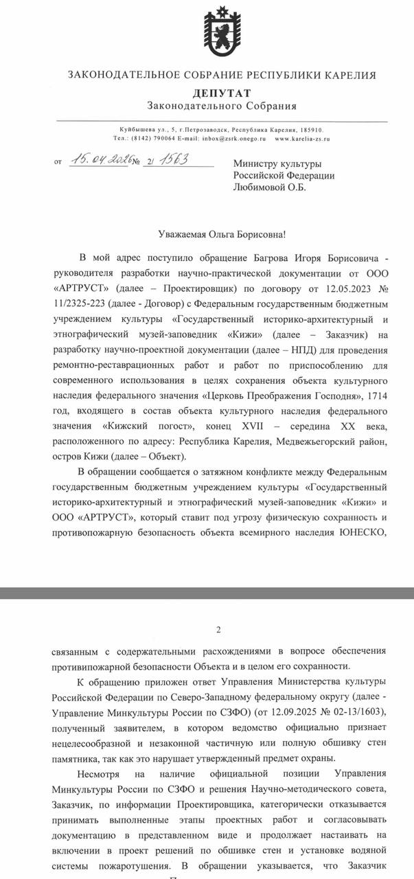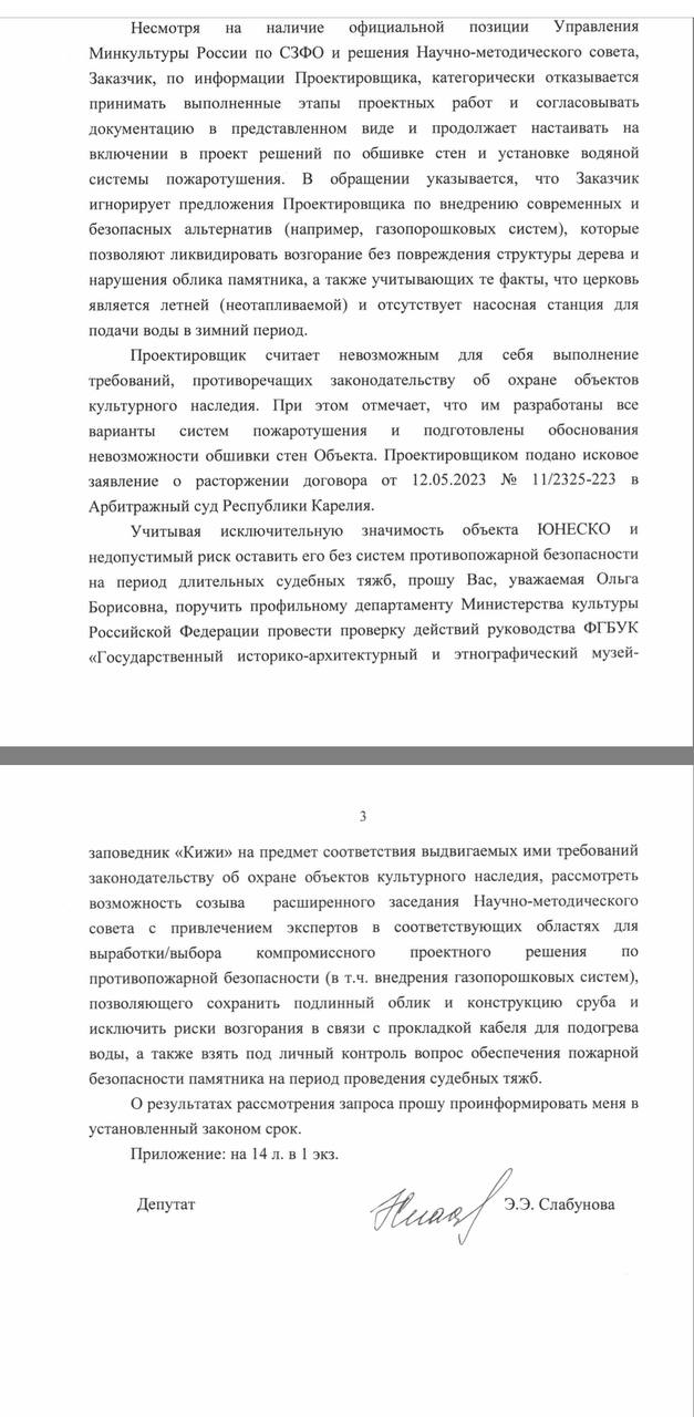 Депутат Заксобрания Карелии Эмилия Слабунова направила официальные запросы министру культуры РФ Ольге Любимовой и в Совет при Президенте по культуре. В них она просит проверить действия руководства музея на соответствие закону об охране памятников, созвать экстренное заседание экспертов для выбора компромиссного решения, которое сохранит уникальный деревянный сруб и одновременно обеспечит безопасность, а также взять ситуацию под личный контроль на время судебных разбирательств.