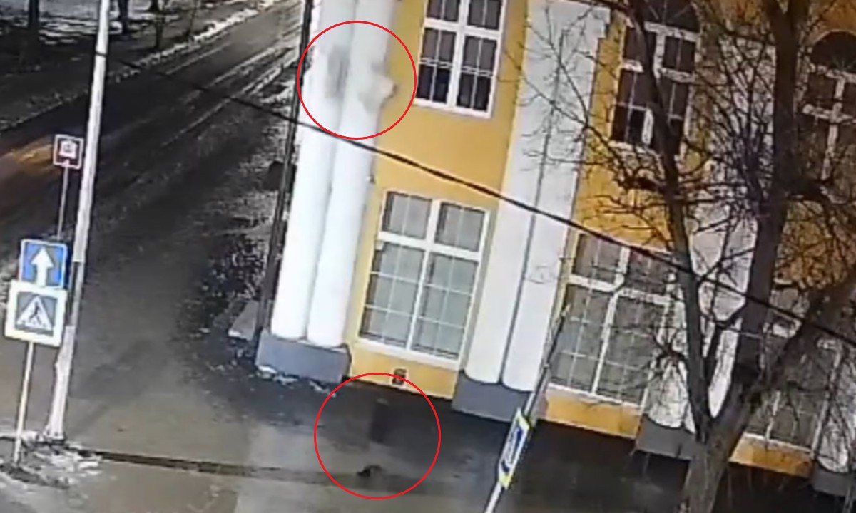Видео обрушения колонны появилось в городском паблике. На кадрах видно, как со здания Музейного центра и библиотеки (на пересечении улиц Советская и Мира) падает часть колонны. Упавшие куски чуть не убили девушку, которая в тот момент проходила мимо.