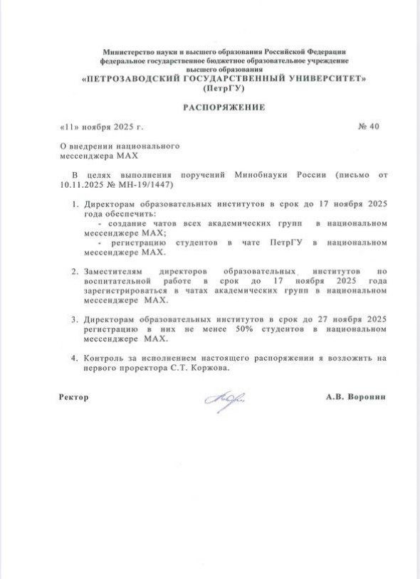 Петрозаводский государственный университет (ПетрГУ) официально подтвердил Daily, что с 11 ноября 2025 года в вузе начинается внедрение национального мессенджера MAX. Об этом свидетельствует распоряжение ректора Анатолия Воронина, присланное в редакцию нашим читателем.