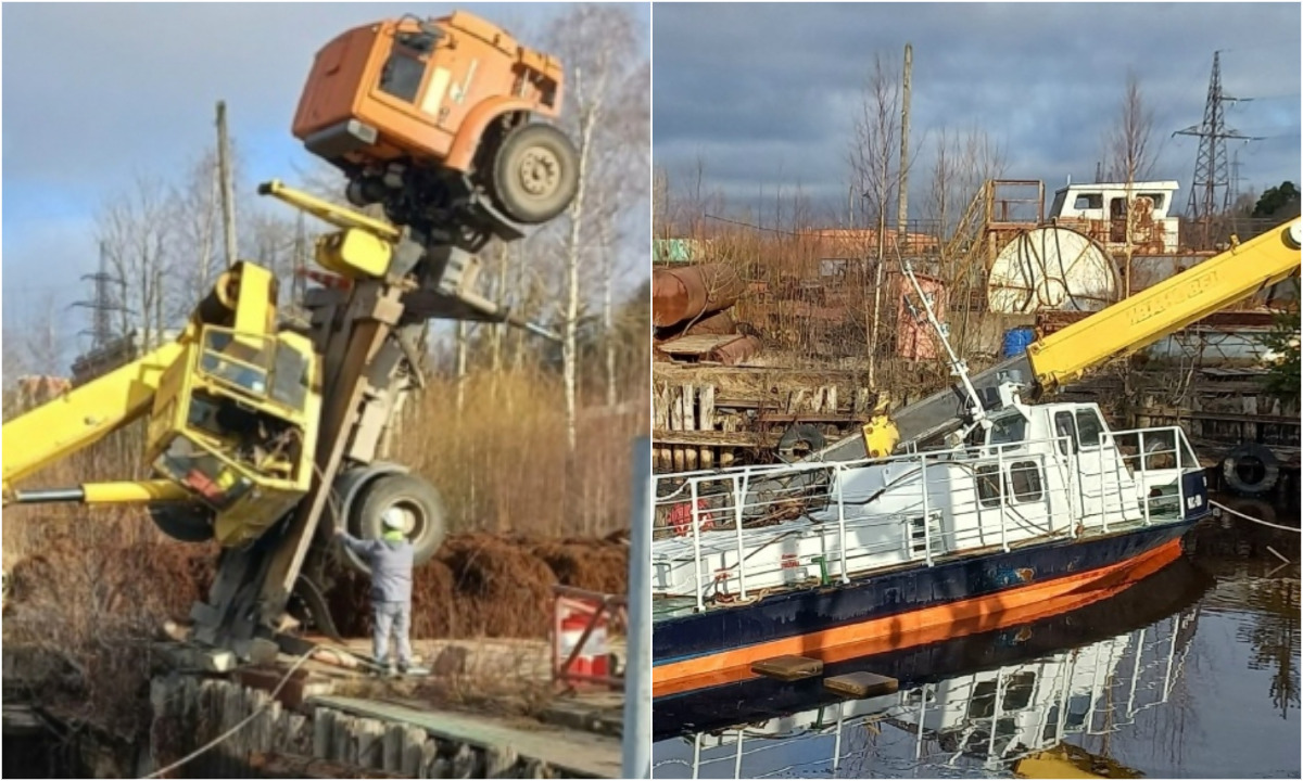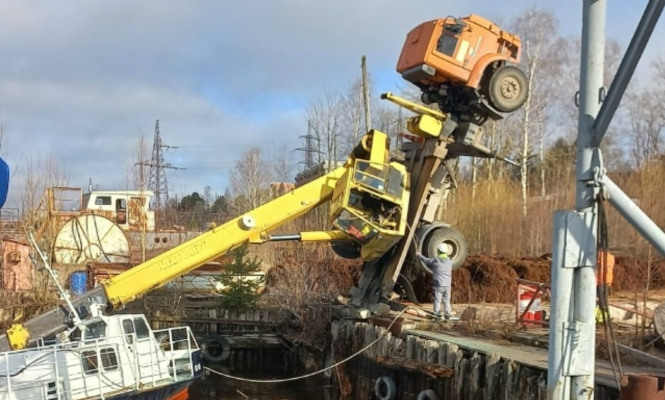 В Кондопоге перевернулся автомобильный кран, который спускал на воду катер в ЦБК.