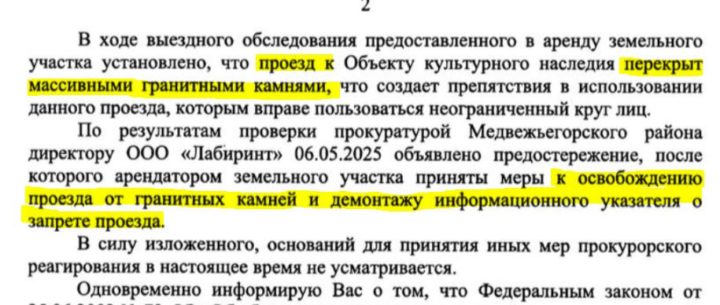 Выездное обследование подтвердило, что проезд к памятнику, который имеют право посещать все, был закрыт гранитными камнями. 6 мая прокуратура Медвежьегорского района объявила директору ООО «Лабиринт» предостережение, после которого арендатор участка очистил проезд от гранитных камней и демонтировал указатель с запретом проезда.