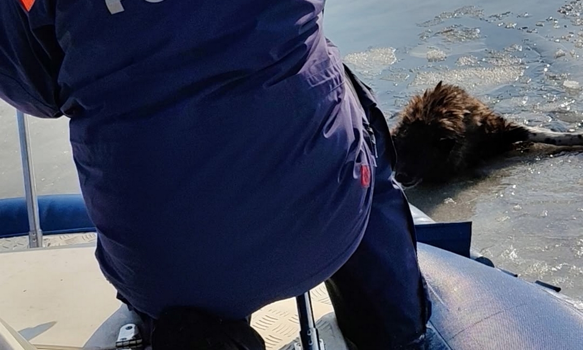 Пес оказался в ледяной воде в районе острова Пунсунсаари. Фото спасения собаки опубликовала ГИМС Питкяранты.