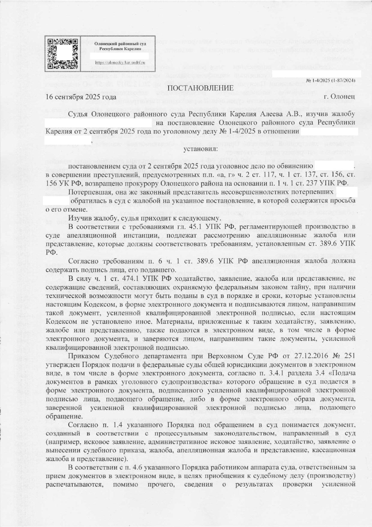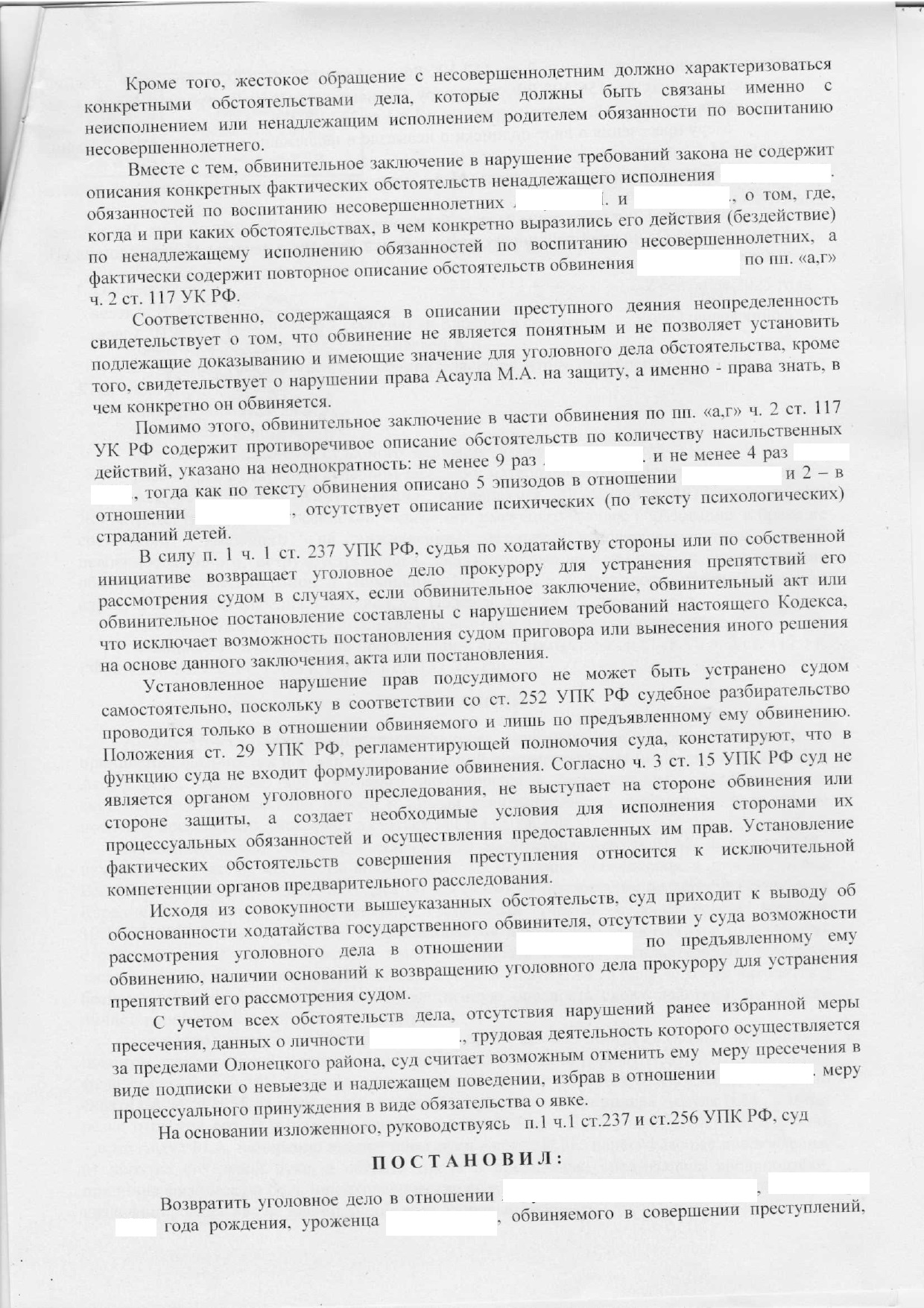 Уголовное дело в отношении мужчины, обвиняемого в систематическом истязании двух своих несовершеннолетних детей в Олонце, возвращено судом в прокуратуру. Бывшая жена тирана опасается, что следствие затянется, и дело может быть закрыто по истечении сроков давности.