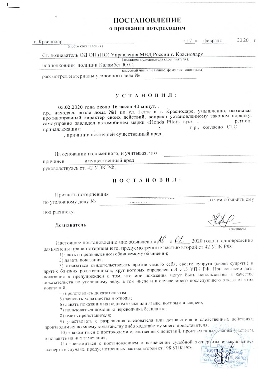 Мария сразу заявила об угоне, предоставила записи с камер и контакты бывшего мужа. Уезжающего на авто Михаила видели и свидетели, которых сразу допросили сотрудники уголовного розыска. В итоге дело завели только после того, как журналист «Комсомольской Правды» разместила статью и обратилась за комментарием в Главное Управление МВД по Краснодарскому краю. Мужчине вменили самоуправство, осудили и обязали его выплатить штраф в размере 30 тысяч рублей. Он ничего не оплатил и вообще обжаловал приговор. Пока дело гуляло по инстанциям, истек срок исковой давности.