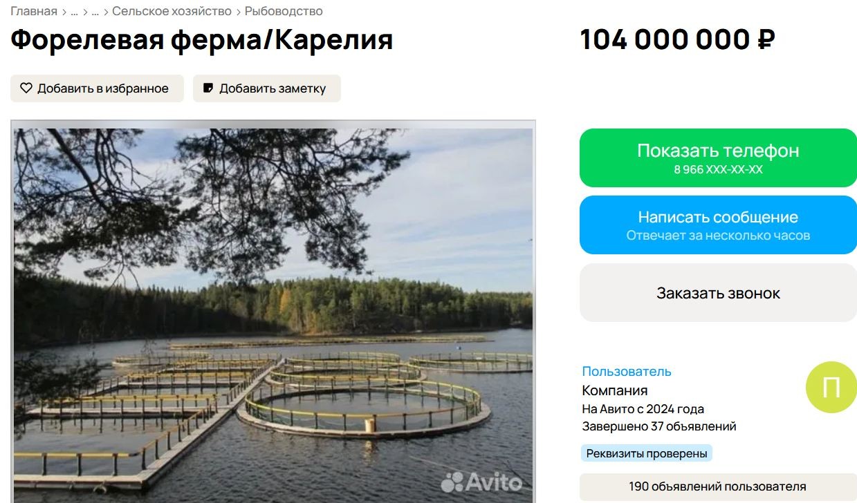 На сайте «Авито» появилось объявление о продаже действующей форелевой фермы площадью 22 га вместе с земельным участком в 15 соток, который находится в аренде на 49 лет — до 2043 года. На территории комплекса есть производственные помещения (бытовки, склад), дом для проживания персонала, баня, причал и пирс, построенные в 2025 году.