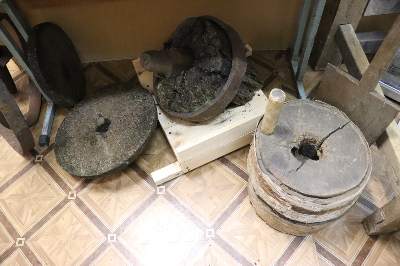Всего в коллекции школьного музея три пары жерновов: постав с водяной мельницы и две пары ручных — каменные и деревянные.