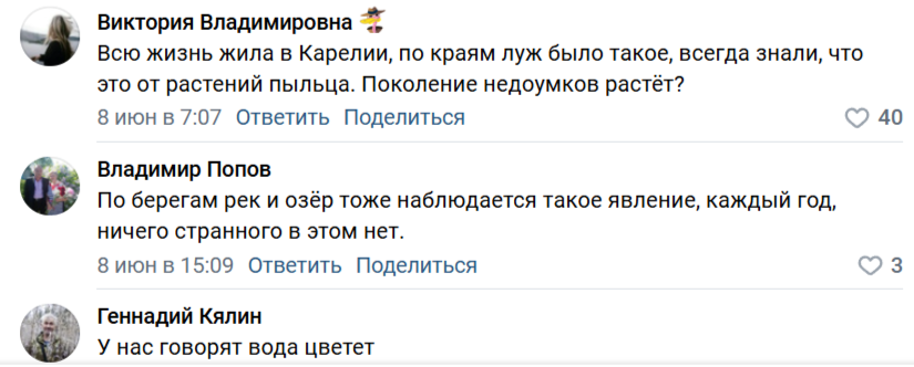 Жители Медвежьегорского района, в частности, села Толвуя, обращались в различные ведомства по поводу желтого налета на воде Онежского озера. Выяснилось, что беспокойство было напрасным: взвесь на воде из пыльцы типична для мая-июня и никакого вреда не несет.