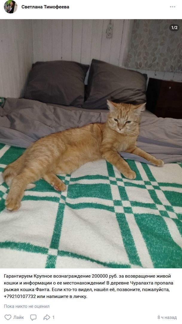 — Гарантируем крупное вознаграждение 200 тысяч рублей за возвращение живой кошки и информацию о ее местонахождении! В деревне Чуралахта пропала рыжая кошка Фанта. Если кто-то видел, нашел ее, позвоните, пожалуйста, +79210107732 или напишите в личку, — написала хозяйка в паблике «Сяпся | Säpsü».