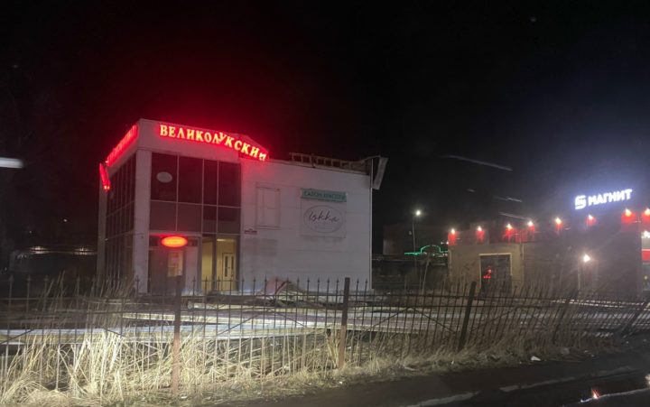 В Карелии сильный ветер снес кровлю и погнул вывески здания: лишь чудом никто не пострадал.