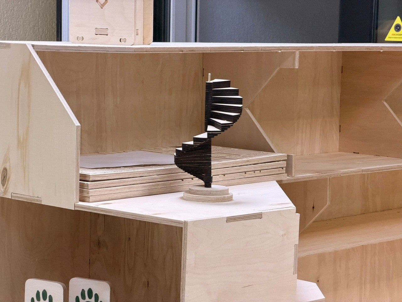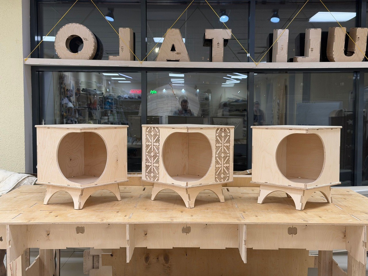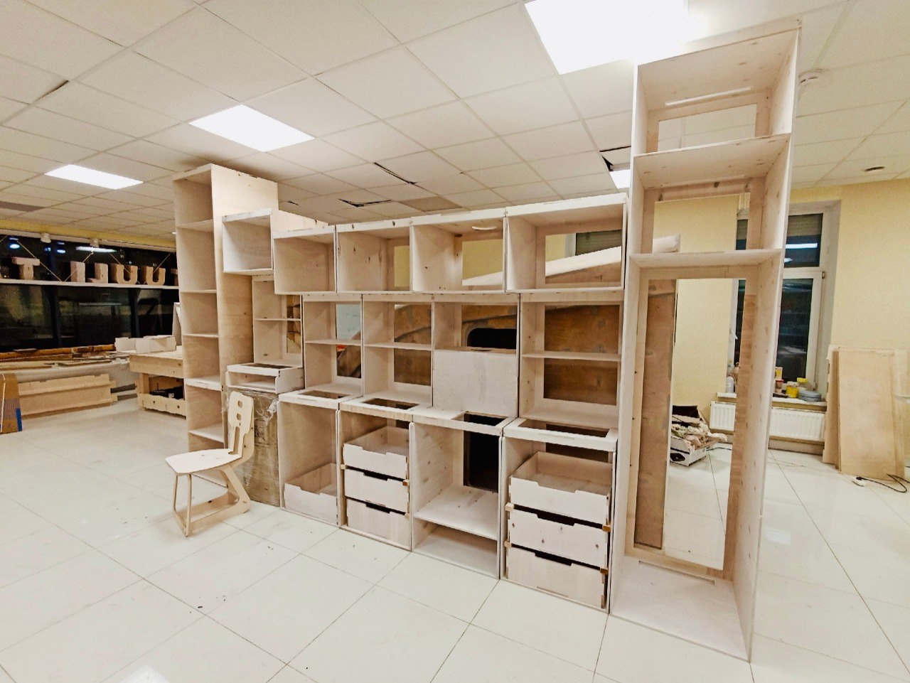 Ключевая особенность мебели — уникальная шип-пазовая компоновка, которая значительно повышает прочность конструкции по сравнению с традиционной мебелью из ЛДСП, гарантируя долговечность и безопасность. А использование ЧПУ-станка позволяет воплощать в жизнь различные формы и дизайны: сотрудники могут быстро создавать уникальную и персонализированную мебель.