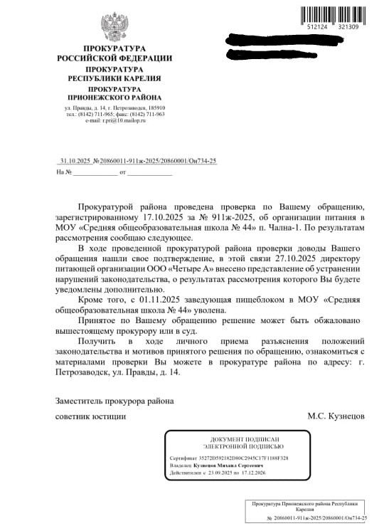 После статьи Daily прокуратура Прионежского района начала проверку в школе. Сотрудники ведомства уже осмотрели пищеблок и проверили соблюдение требований санитарно-эпидемиологического законодательства при организации питания детей.