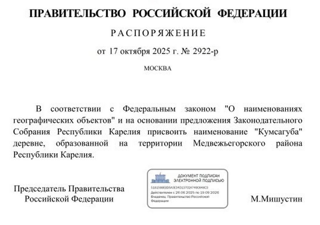 В Медвежьегорском районе деревня, которая пропала с карт в 1984 году, возвращается. Премьер-министр России Михаил Мишустин подписал распоряжение дать поселению на месте упраздненной деревни историческое название — Кумсагуба. Впрочем, местные жители и не прекращали называть поселение Кумсагубой.