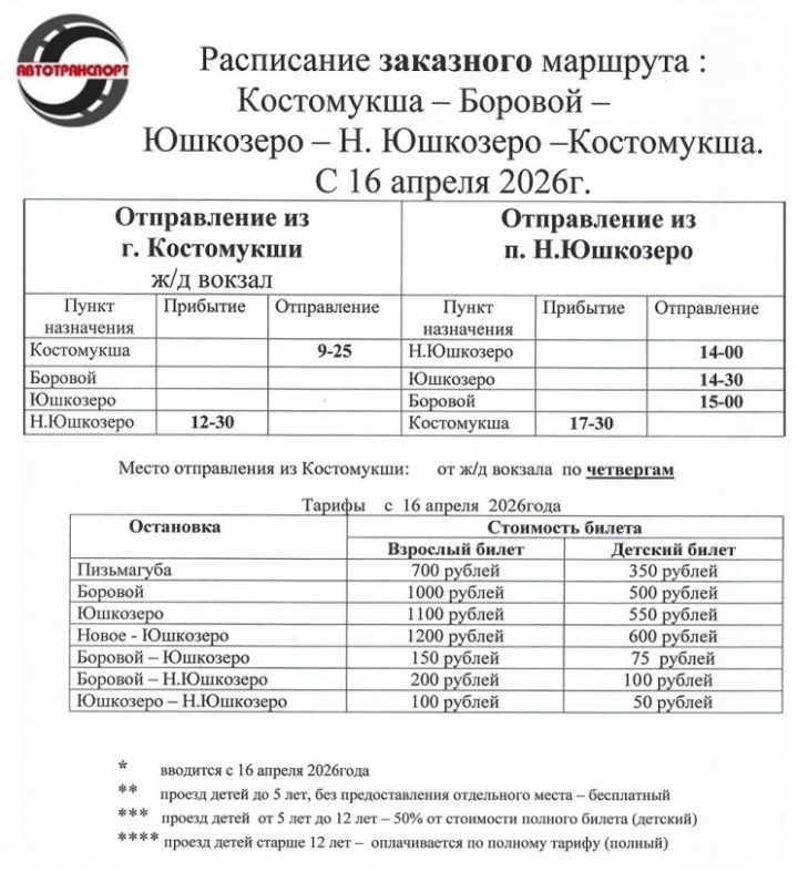 Рейс Костомукша – Боровой – Юшкозеро – Новое Юшкозеро будет отправляться раз в неделю по четвергам из Костомукши в 9:25 от железнодорожного вокзала. Из Нового Юшкозера он будет выходить в этот же день в 14:00, из деревни Юшкозеро – в 14:30, из посёлка Боровой – в 15:00.