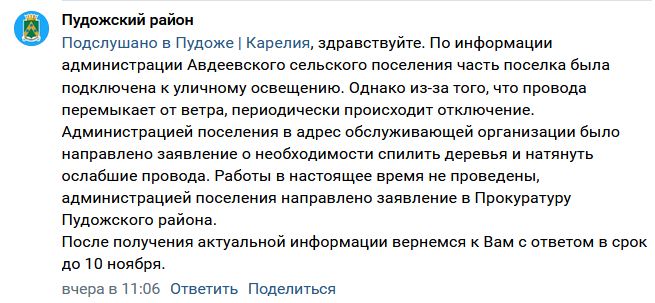 В администрации района отметили, что часть поселка была подключена к уличному освещению, но из-за того, что провода перемыкает от ветра, свет периодически выключается. Чиновники отправили обслуживающей организации заявление о необходимости спилить деревья и натянуть ослабшие провода. Пока что работы так и не провели, а администрация поселения обратилась за помощью в прокуратуру.