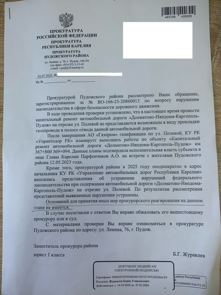В Минтрансе Карелии сообщили, что капитальный ремонт участка улицы Полевой (в составе трассы «Долматово – Няндома – Каргополь – Пудож») запланирован на 2026 год. Работы протяженностью 1,3 км должны завершиться в 2027 году. Проект предусматривает полную замену грунтового покрытия на асфальт. При этом чиновники добавили, что возможности для обеспыливания дороги сейчас нет.