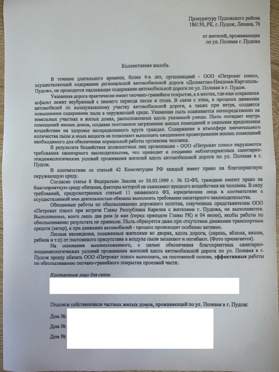 Жители пыльной улицы написали коллективную жалобу на бездействие компании, обслуживающей дорогу, в прокуратуру района.