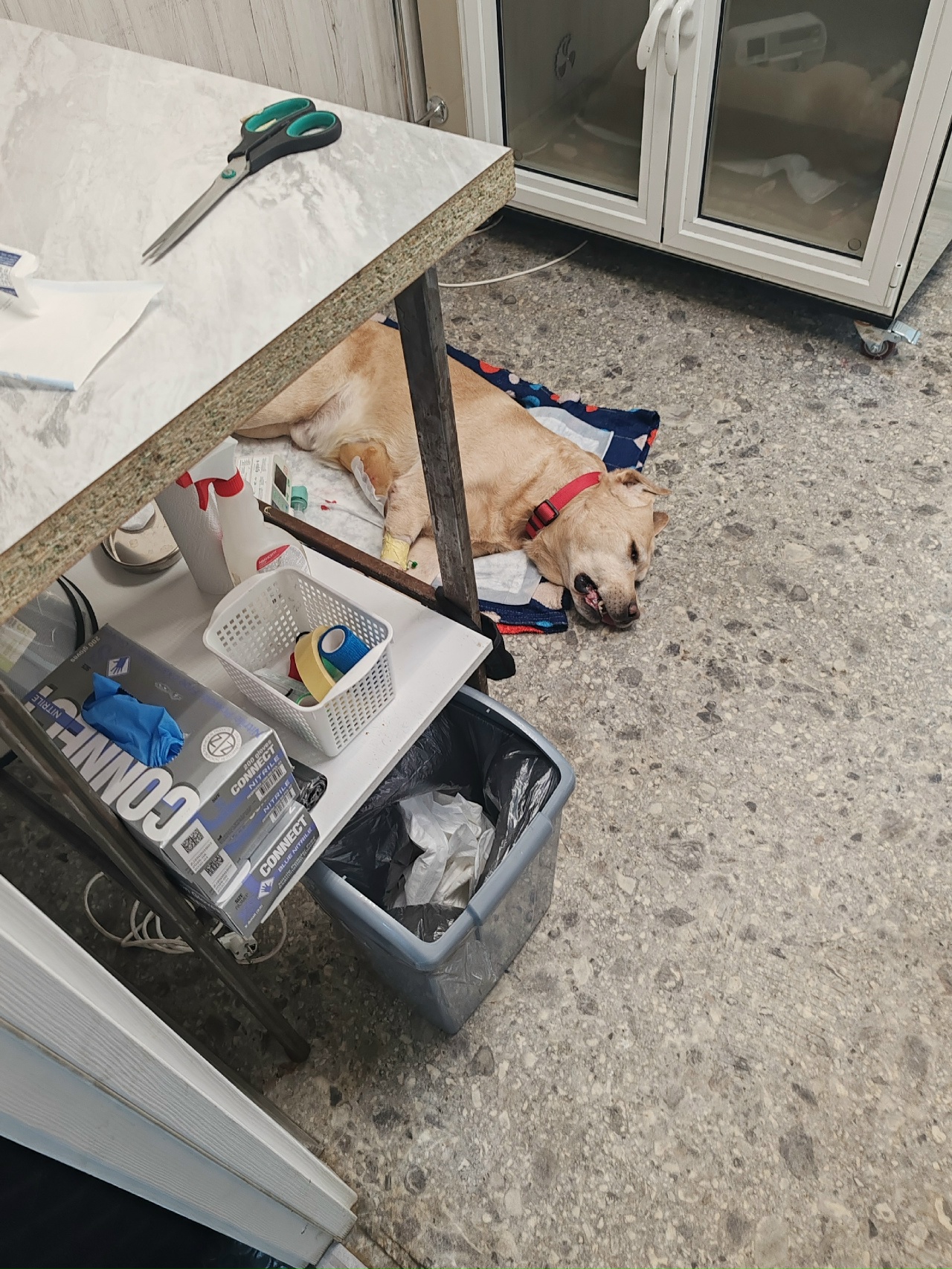 Как сообщила нам хозяйка, у лабрадора распорото брюхо, ночь пришлось провести в ветеринарной клинике, где псу провели операцию.