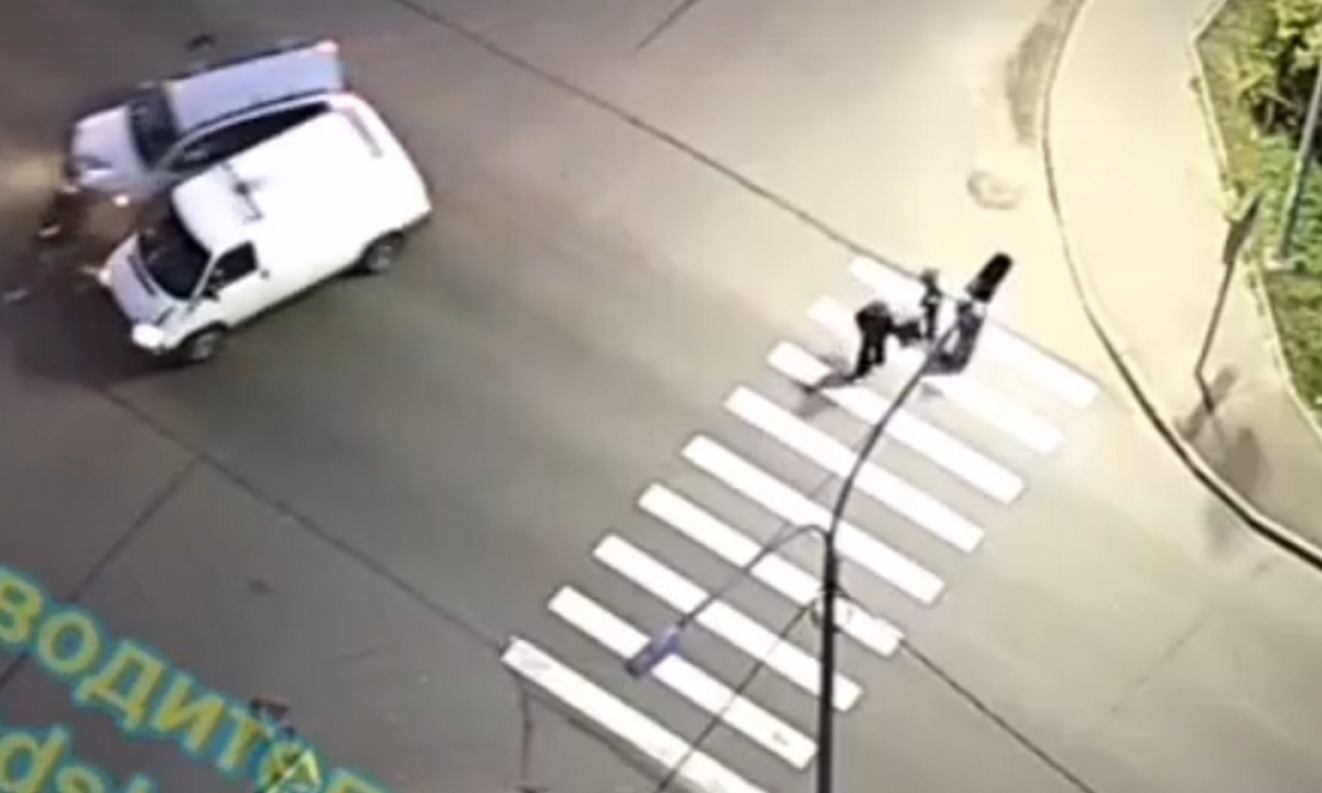 Два автомобиля столкнулись прямо перед пешеходами: «Ховер» не уступил дорогу микроавтобусу «Фольксваген». После удара автомобили развернуло на проезжей части. Пешеходы испуганно разбежались