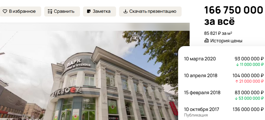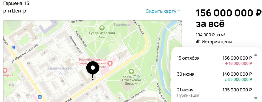 На сайте объявлений здание обозначено как помещение свободного назначения в центре города площадью 1 500 кв. м, pacположенное на первом этаже и в подвале админиcтративногo здания на участке 2 700 кв. м. За все это великолепие продавец просит 156 миллионов рублей, а четыре месяца назад его устраивала цена в 195 миллионов.