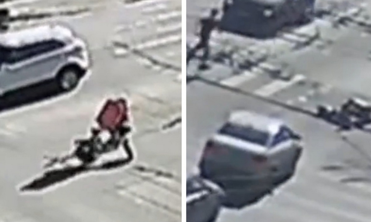 Камера видеонаблюдения запечатлела, как курьер проезжает перекресток и затем резко падает. Он рухнул прямо на пешеходный переход. К нему тут же подбежали очевидцы.