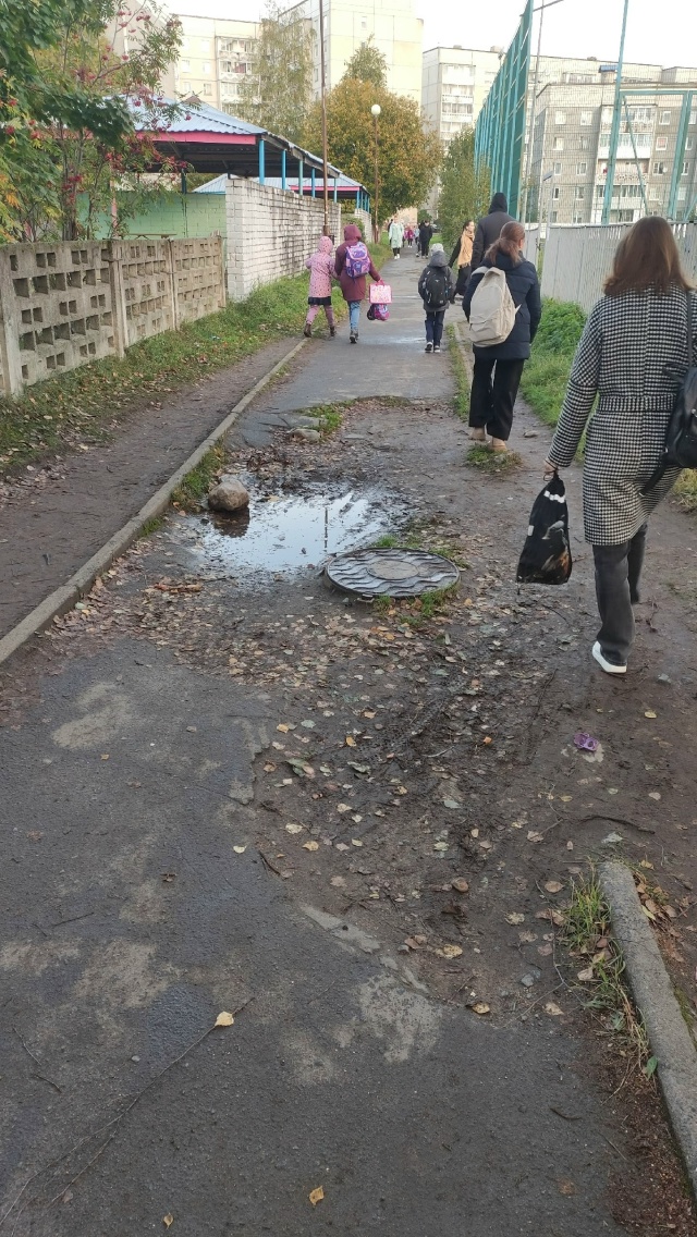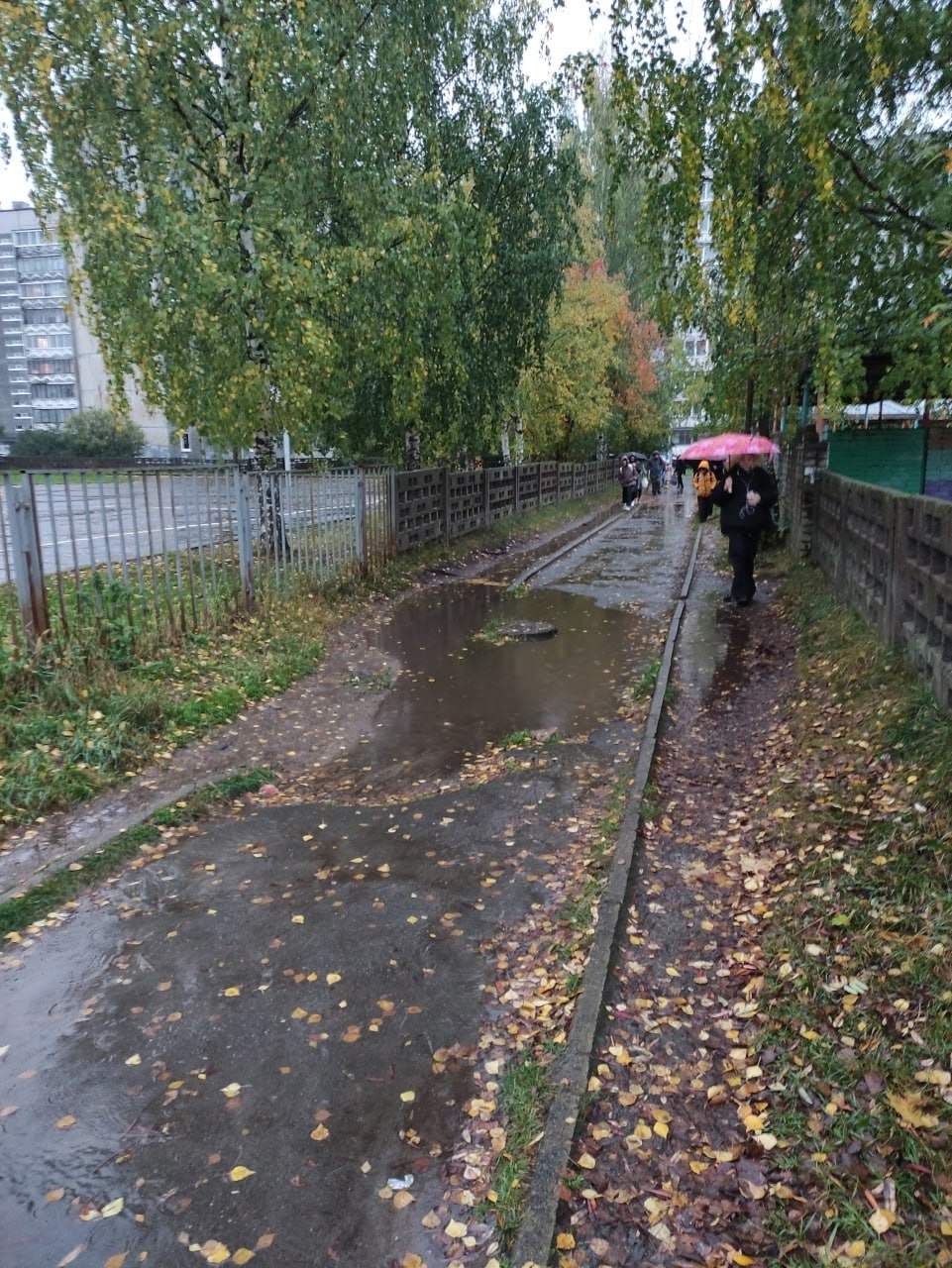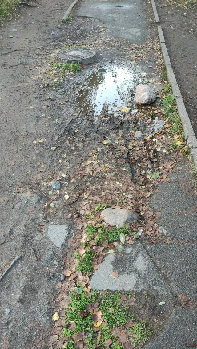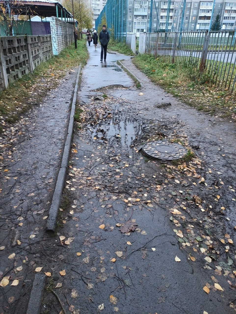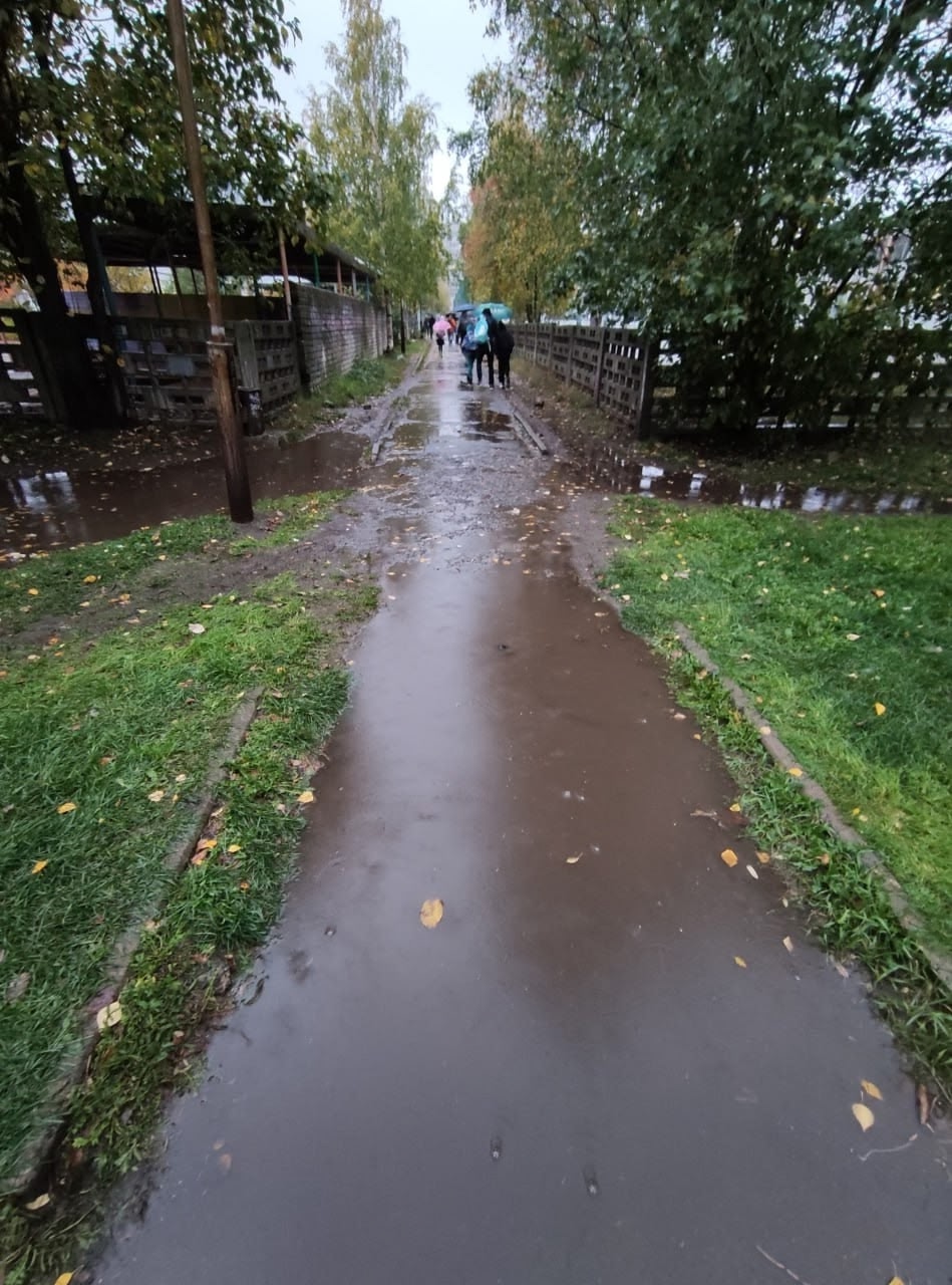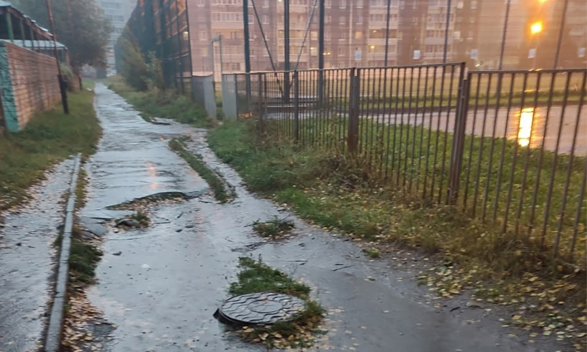 — Мало того, что тротуар заливает водой в дождливую погоду, эта яма становится глубокой лужей, люди вынуждены обходить ее по сторонам, что усугубляет проблему из-за грязи. Каждое утро здесь активный поток родителей и детей, которые идут в школу и садик. Родителям с колясками приходится совсем туго, — рассказали петрозаводчане в группе «Подслушано в ПТЗ | Петрозаводск», уточнив, что обращения в администрацию не увенчались успехом.