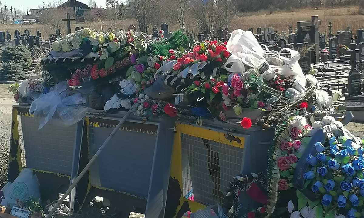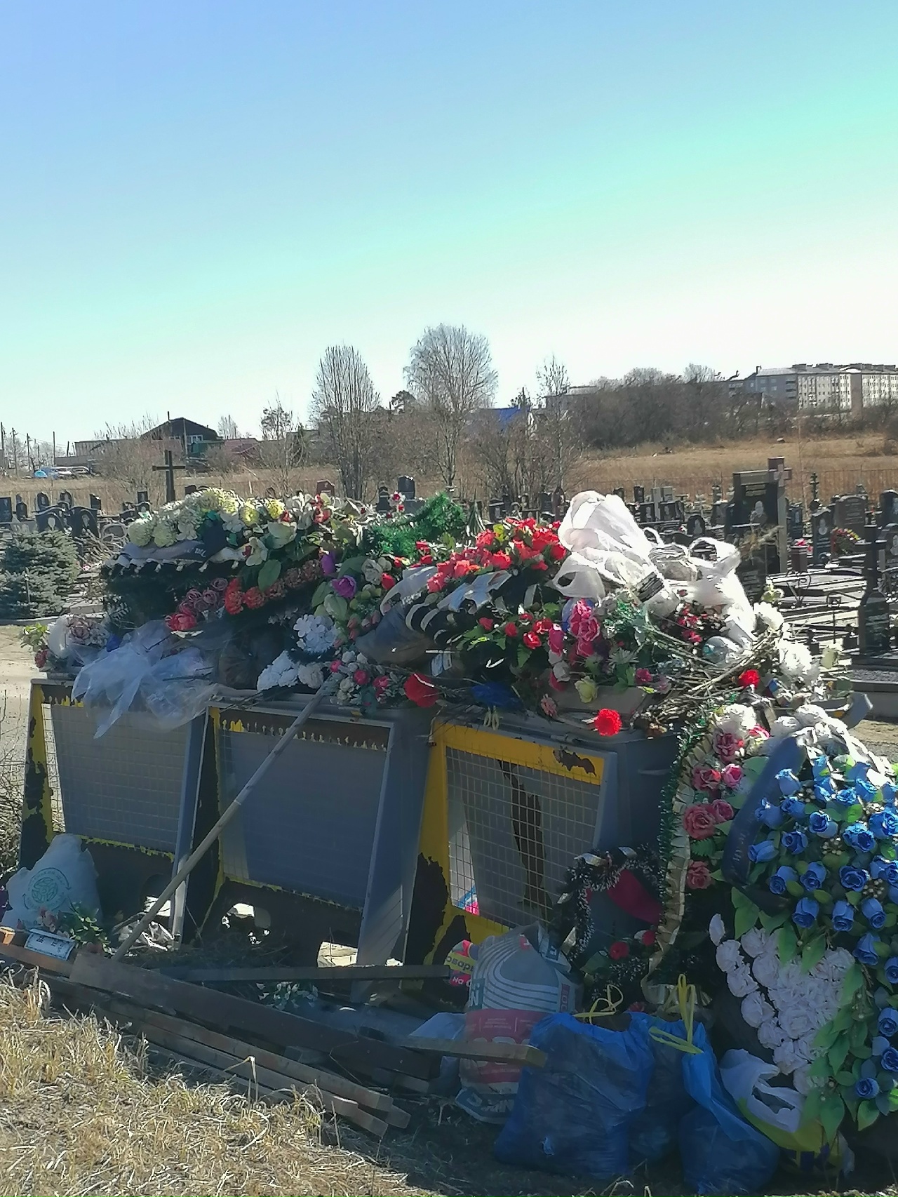 — Седовласый мужчина подвозит на тачке охапку использованных свежезаготовленных веток ели, аккуратно выкладывает их возле баков. А вот и скорбная процессия. Через дорогу, там, где трепещут на ветру на фоне синего неба флаги всех видов войск, стоят и не спешат разойтись люди. Кого-то проводили в последний путь. Внука, сына, мужа, брата? На фоне этого людского горя тем более неловко, что не только в наших городских дворах, но и здесь, на почетном участке кладбища, растут горы мусора из отслуживших свой срок цветов, венков, пластиковых стаканов и банок... Что скажут по поводу этой свалки администрация кладбища, коммунальщики? — задается вопросом Ольга. — Ведь подобное происходит не впервые!