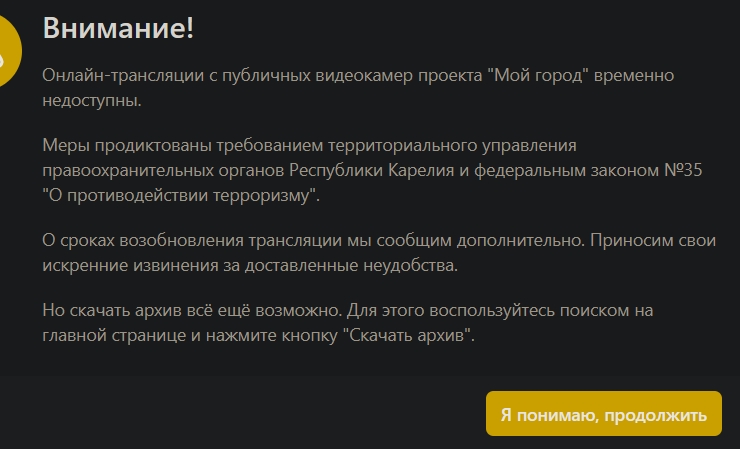 — Онлайн трансляции с публичных видеокамер «Ситилинка» в Карелии временно недоступны. Меры продиктованы требованием правоохранительных органов и федеральным законом №35 «О противодействии терроризму». О сроках возобновления трансляции мы сообщим дополнительно. Архив видеозаписей остается доступным. Благодарим вас за понимание!— сообщили в компании «Ситилинк».