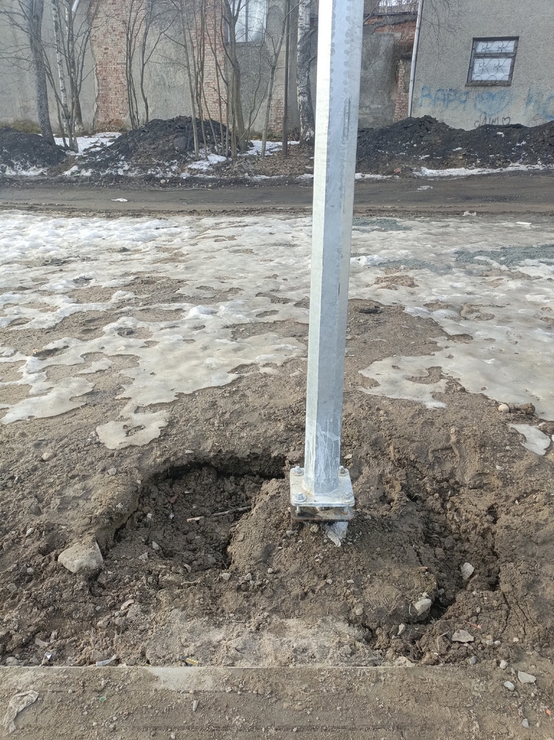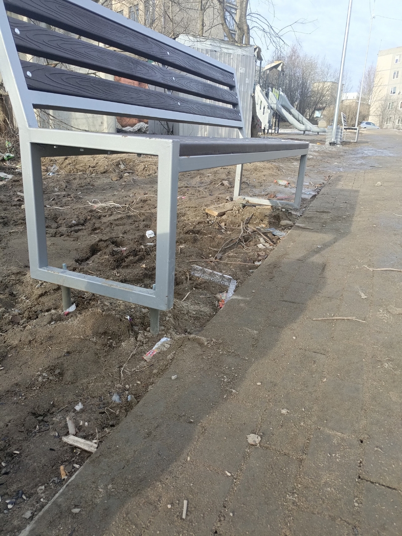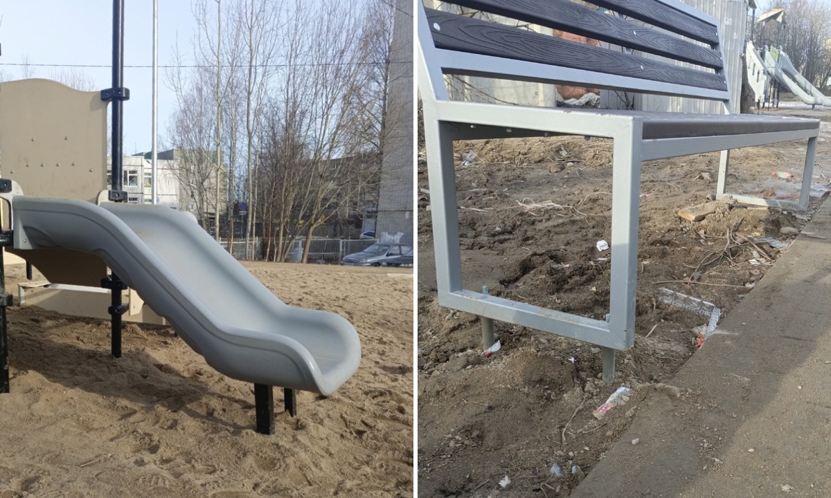 Также конструкция площадки вызывает вопросы. Горка для малышей слишком высокая — ребёнок при приземлении может сильно удариться. Скамейки и часть оборудования не до конца утоплены в землю. Песочница стоит на камне, а песка в ней почти нет. Мусорные баки переполнены, отходы разнесло по территории — дворника на площадке, видимо, не предусмотрели. А землю размыло так, что образовались ямы, даже у фонарного столба основание подмыто. Список требований не из сложных. Главное, чтобы чиновники услышали тех, ради кого всё это строили.