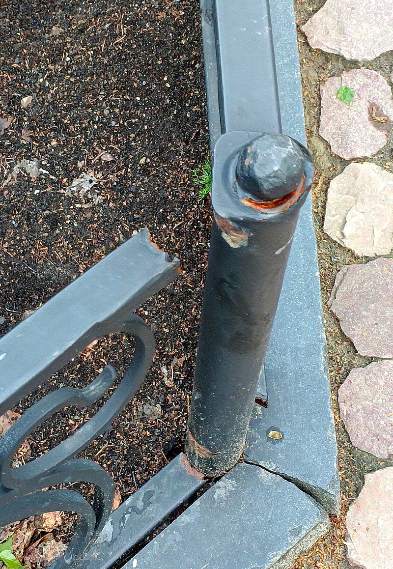 Даты и буквы на монументе разного цвета. На фото видно, что монумент покрывается ржавчиной, ограда вокруг скульптуры в трещинах.