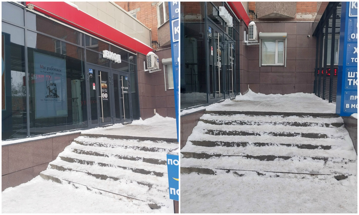 Жители города пожаловались на неубранную лестницу на крыльце у «Невского Пассажа», на которой можно поскользнуться и разбить себе голову. По словам автора фото, на опасный вход в здание в мэрию жалуются регулярно, но ничего не меняется.