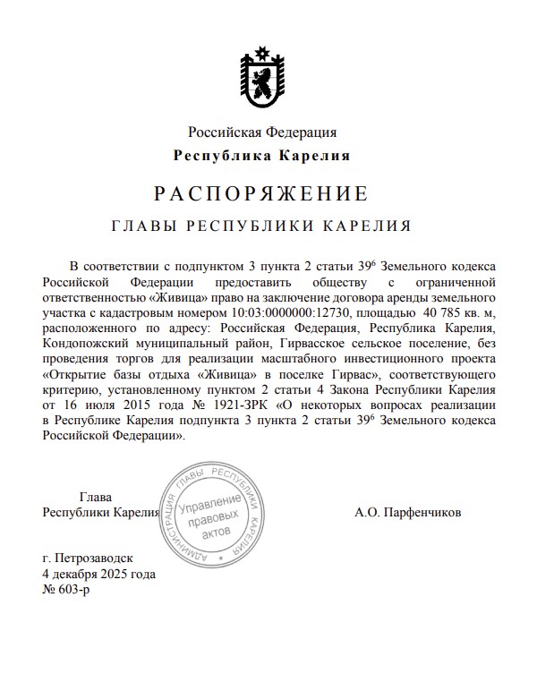 В поселке Гирвас Кондопожского района постоят базу отдыха. Землю под строительство компания «Живица» получила без проведения торгов. С ней заключат договор аренды. Соответствующее распоряжение подписал глава Карелии Артур Парфенчиков.