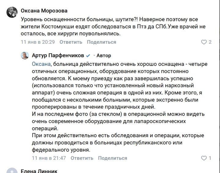 —Аппарат СКТ фактически выработал ресурс, пациентов отправляли в Сегежу, а новые КТ и МРТ лишь планируют установить где-то в этом году. С жильём для врачей — тоже сложно, денег на компенсации аренды не хватает. Но, как видно, за месяц многое изменилось. Теперь больница — флагман, опора севера Карелии и пример успешного государственно-частного партнёрства. Осталось только понять, где именно между аудитом, долгами и сокращениями начался этот резкий прорыв, — писал местный телеграм-канал.