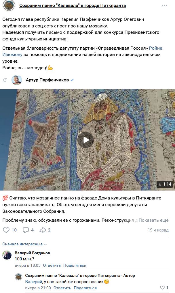 — 100 миллионов? — удивился житель в комментариях в паблике «Сохраним панно «Калевала» в городе Питкяранта».