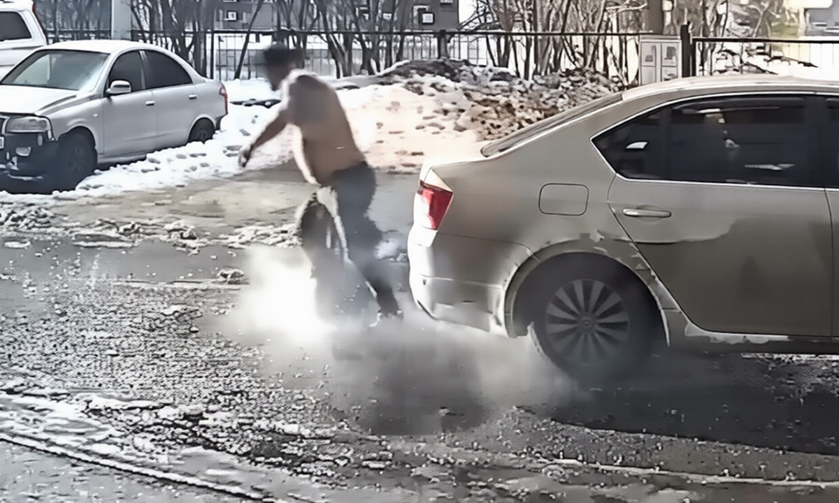 В Уфе пьяный полуголый водитель намеренно сбил пешехода, а потом еще и избил его. За пострадавшего вступились прохожие.