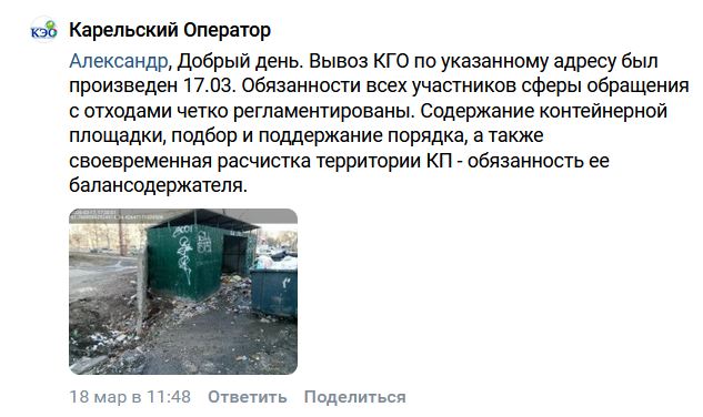 Под постом КЭО отчитался о вывозе мусора с площадки 17 марта, как всегда отметив, что за содержанием мусорки должна следить управляющая компания, ТСЖ или другой балансодержатель, а не оператор по вывозу мусора.