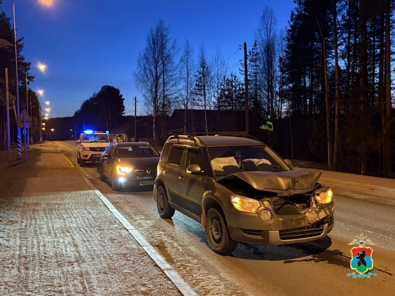 Вчера, 11 апреля, в 19:55 произошло ДТП на улице Верхней в Медвежьегорске (636 км трассы А-119, Вологда-Медвежьегорск). По предварительной версии полиции, 60-летний мужчина-водитель, управляя Skoda Yeti, не соблюдая дистанцию, столкнулся с Renault Megan. После чего продолжил движение и пересек сплошную линию разметки для обгона Renault.