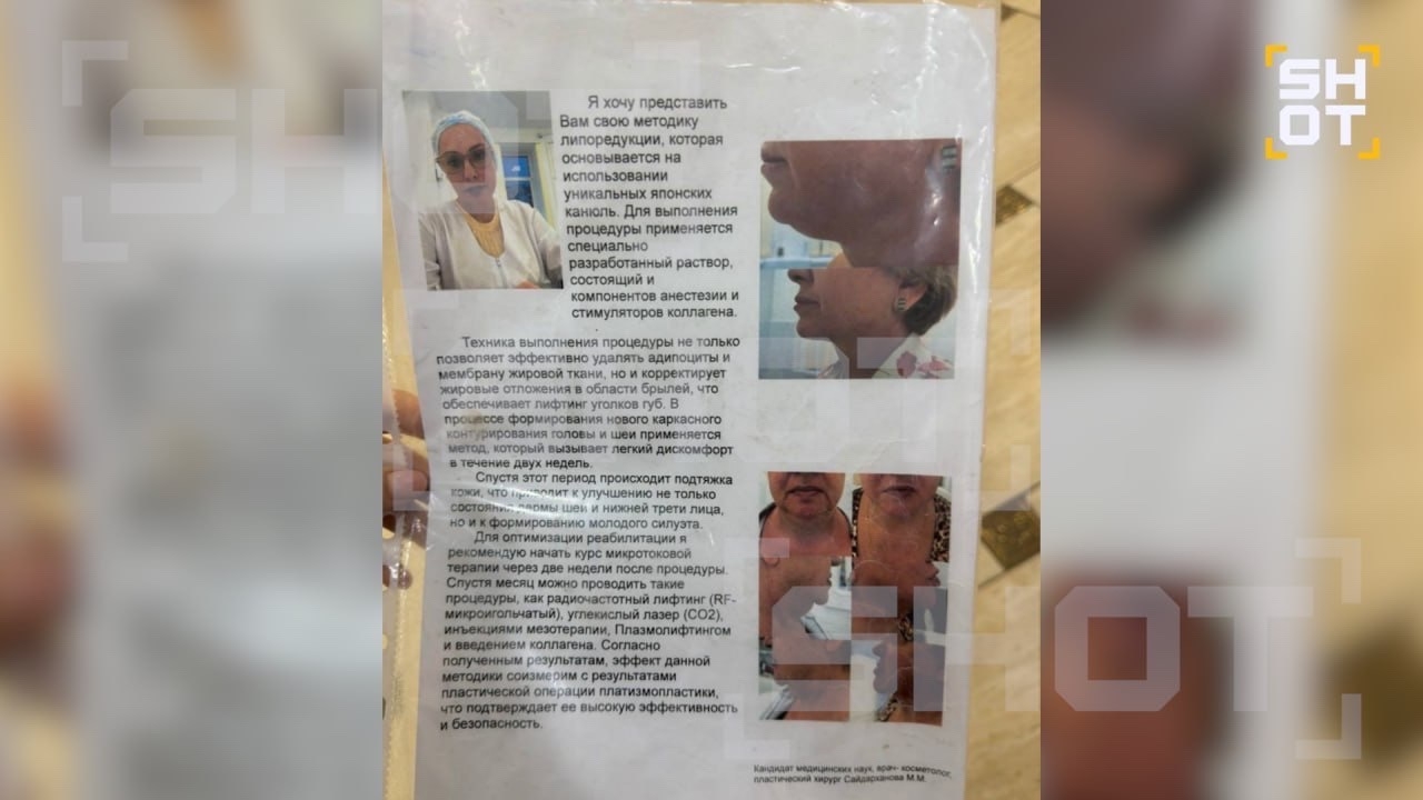 На ресепшене в клинике лежат листовки с рекламой уникальной методики липосакции от пластического хирурга Сайдархановой.