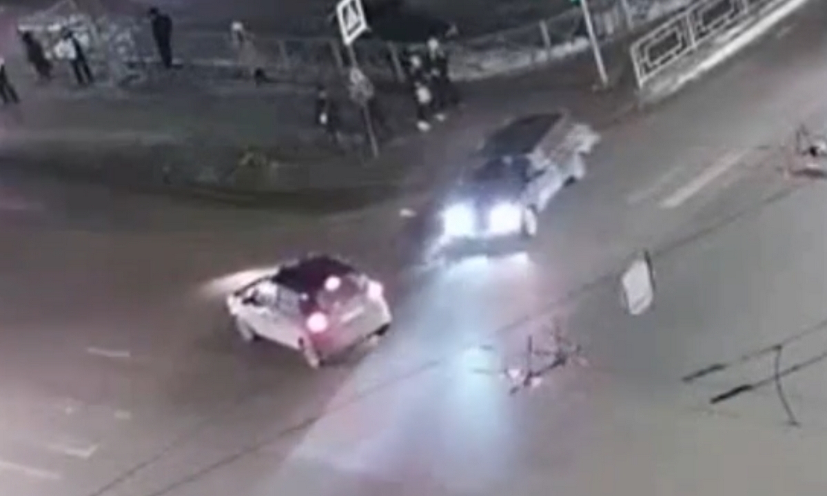 Как запечатлела камера видеонаблюдения, после удара один автомобиль развернуло и чуть не вынесло на тротуар, где стояли пешеходы.