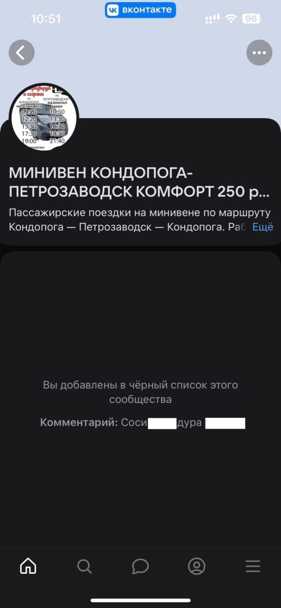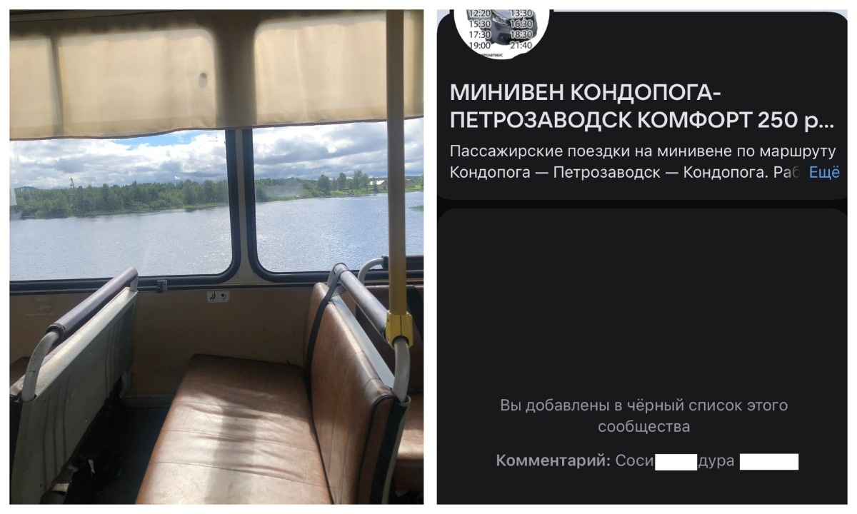 Одна из пассажирок опубликовала в «Подслушано в Кондопоге» скриншот из соцсети, в котором перевозчик грубо отказал ей в услуге и заблокировал на своей странице.