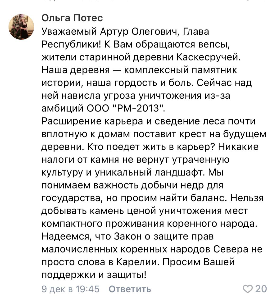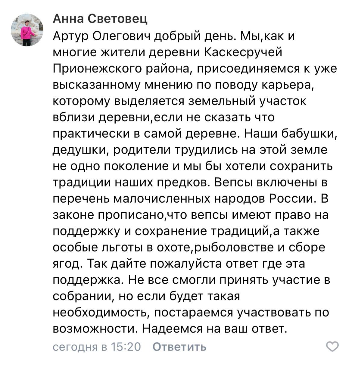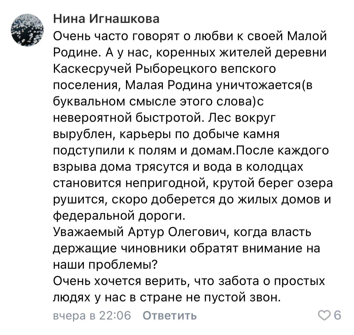 Местные жители возмущены: территория деревни превратилась в «лунный ландшафт», а традиционные угодья вепсов — коренного малочисленного народа, чьи права охраняются законом — исчезают. Из-за взрывов рыба ушла с исконных нерестилищ, в колодцах пропала вода. В деревне нет магазина, не ездит автолавка, жителям приходится ездить за продуктами в Рыбреку, но «перспектива взрывных работ в считанных сотнях метров от домов затмила все остальные беды».