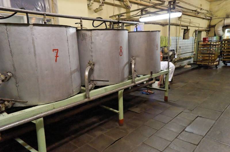 Это не огромные кастрюли, это емкости для закваски, с которой и начинается приготовление любой выпечки. В закваску добавляются специально выращенные молочно-кислые бактерии, которые, кстати, очень привередливы: температура их разведения должна быть от 29 до 31 градуса тепла. Чуть меньше или чуть больше — и они погибнут, и закваска испортится.