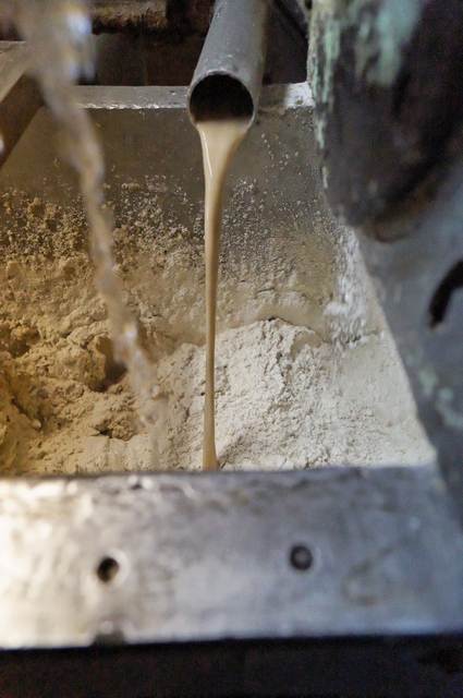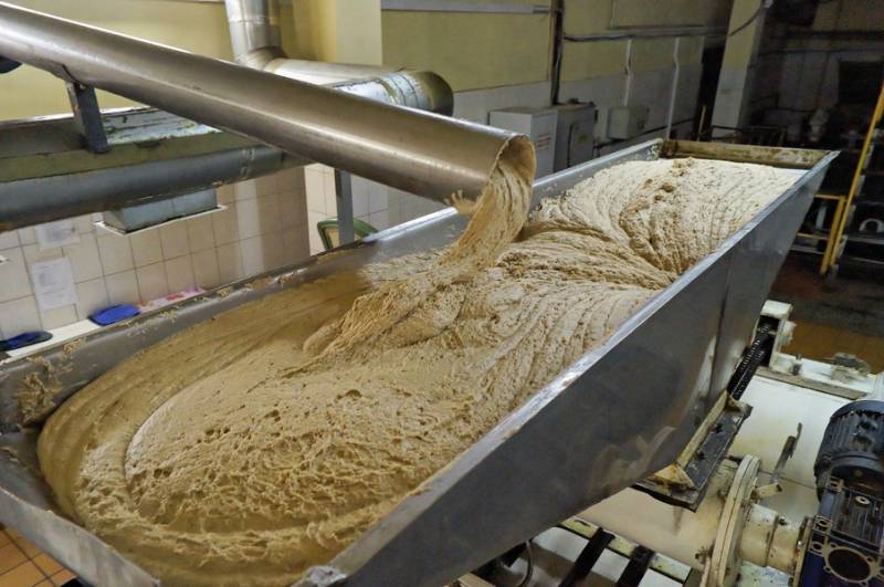 Затем закваска смешивается с мукой. Вся эта «чача» прокручивается огромной шнековой спиралью. Еще бы, руками такой объем теста не замесить.