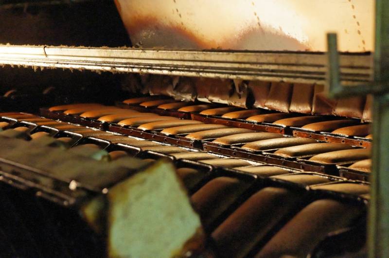 Вот так выглядит румяный хлеб в печи. Когда буханки готовы, машина наклоняет формы и скидывает хлеб на конвейер.