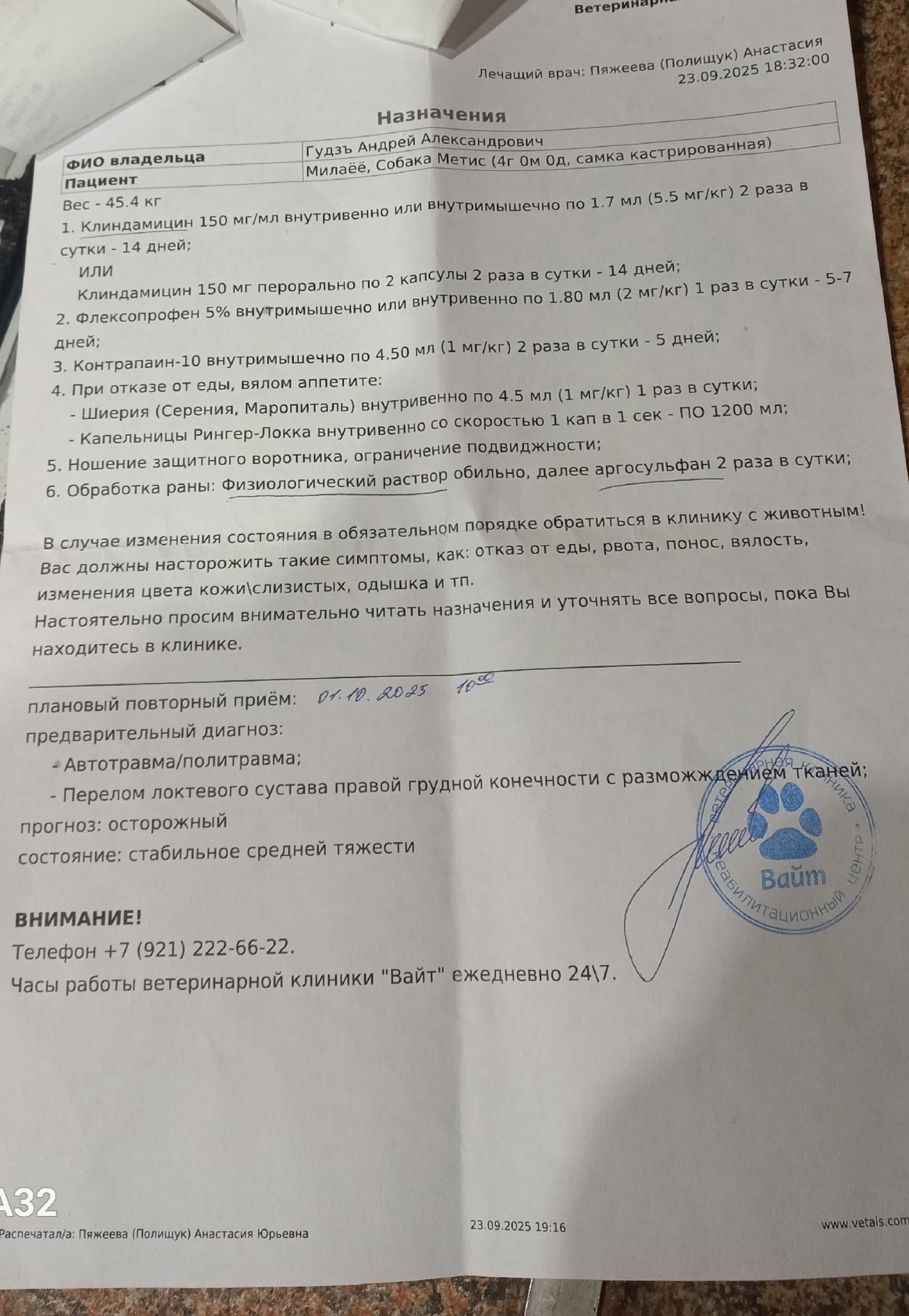 — Нашу любимую собаку сбила машина, у нее перелом правой передней лапы с размозжением тканей. Водитель скрылась с места аварии, помощи с операцией не оказала (она обошлась в более чем 30 тысяч рублей), а мы остались наедине с бедой. Наша собака теперь инвалид, без передней правой лапы. Мы сняли видео с камер, на которых видно, как эта женщина мчится по городу, как она вернулась вместе с мужем на место ДТП во двор в ту ночь, это же подтвердили соседи, которые их видели, — говорит хозяйка собаки Любовь Бирюкова.