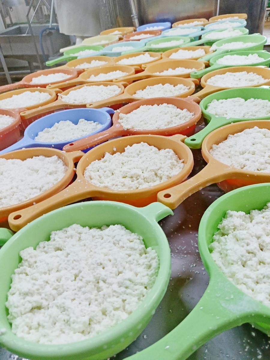 — Молоко на сыр берем сразу с молоковоза, самое свежее и я сразу начинаю процесс пастеризации, который происходит при температуре 94-96 градусов. Затем в полученную смесь заливается творожная сыворотка и дальше начинается самый интересный процесс. Молоко сворачивается и образуются сырные хлопья. Я внимательно, основываясь уже на своем опыте, слежу за этим процессом, чтобы вовремя, ни минутой раньше или минутой позже, начать слив получившегося сырного зерна в формы. Это очень важный момент для того, чтобы сыр получился нежный, вкусный, — рассказывает Ольга.