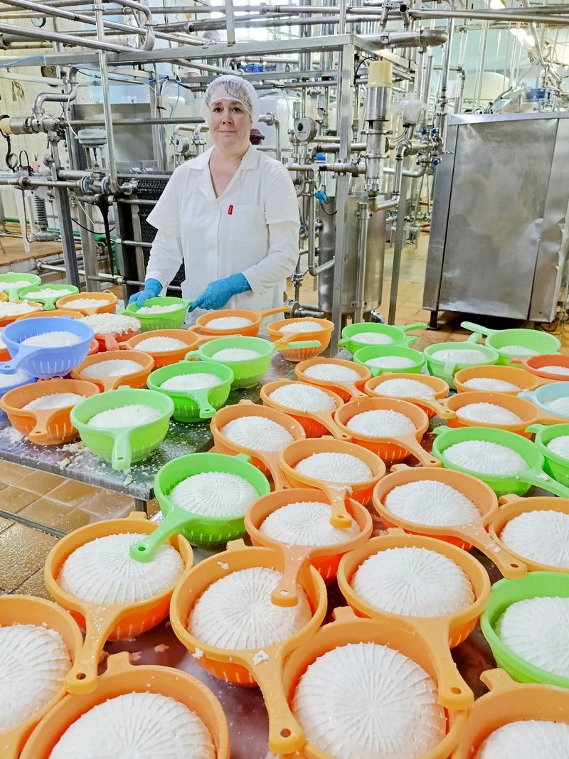 На молочном комбинате участок производства сыра – один из самых сложных. Потому что процесс приготовления сыра трудоемкий, и немного творческий – сыр требует к себе особого внимания. Нелегко найти человека, способного научиться этому кропотливому процессу. На Олонецком молочном комбинате такой сыр готовит сотрудник с огромным опытом — мастер-сыродел четвертого разряда Ольга Иванова!