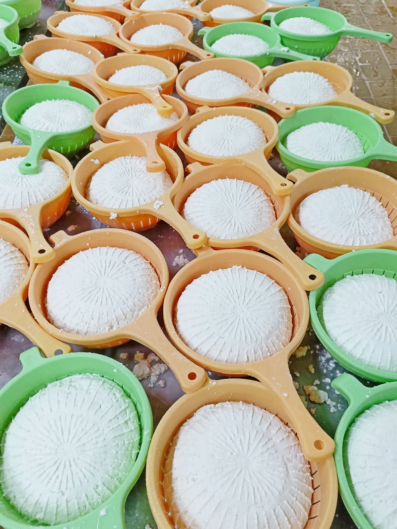 Затем начинается процесс самопрессования сыра. Сыродел переворачивает сырные головки в формах 2-3 раза и солит его. Дальше сыр будет самопрессоваться и охлаждаться в холодильной камере до следующего дня.